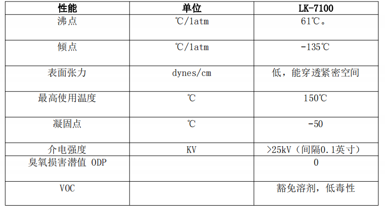 LK-7100电子氟化液是九氟异丁基甲醚产品,它具有零ODP值(臭氧破坏值),具有良好的电绝缘性和化学稳定性,可以应用在电子仪器清洗、光学系统清洗、半导体 制造、热传导等领域。在常温下为无色透明液态物质,较慢的挥发速度,无毒无害,在空气中不具可燃性,表现出极好的安全性、热稳定性,被半导体干蚀刻、晶圆测试、封装等工艺中作为热转移冷却工质。